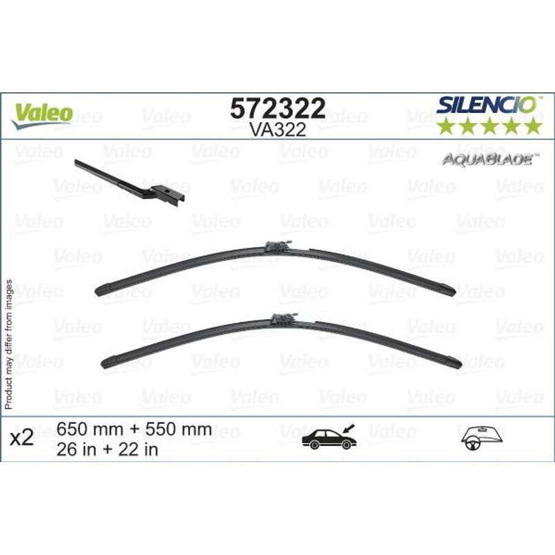 Lamele ștergătoarelor de parbriz VALEO 572322 sunt un set de lame ștergătoare fără ramă din seria Silencio AquaBlade, concepute pentru autovehiculele cu volan pe stânga. Setul include două lamele de ștergător: 650 mm (26 inch) și 550 mm (22 inch) lungime, echipate cu duze integrate fără încălzire.